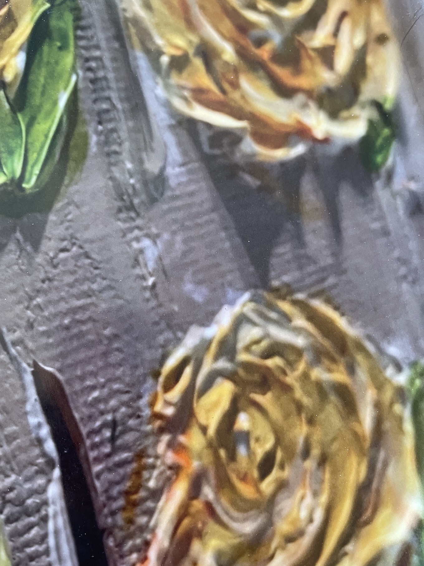 Underbar bricka i ett lagom format. Närbilden är från tavlan Peach Roses där jag använt lager av olika strukturpastor samt byggt rosorna som därefter färglagts flera gånger.