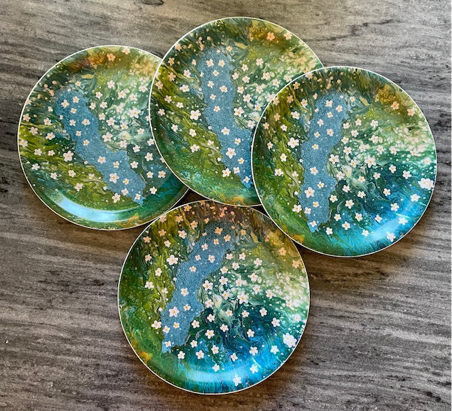 31 cm diameter. Tillhörande glasunderlägg finns också.