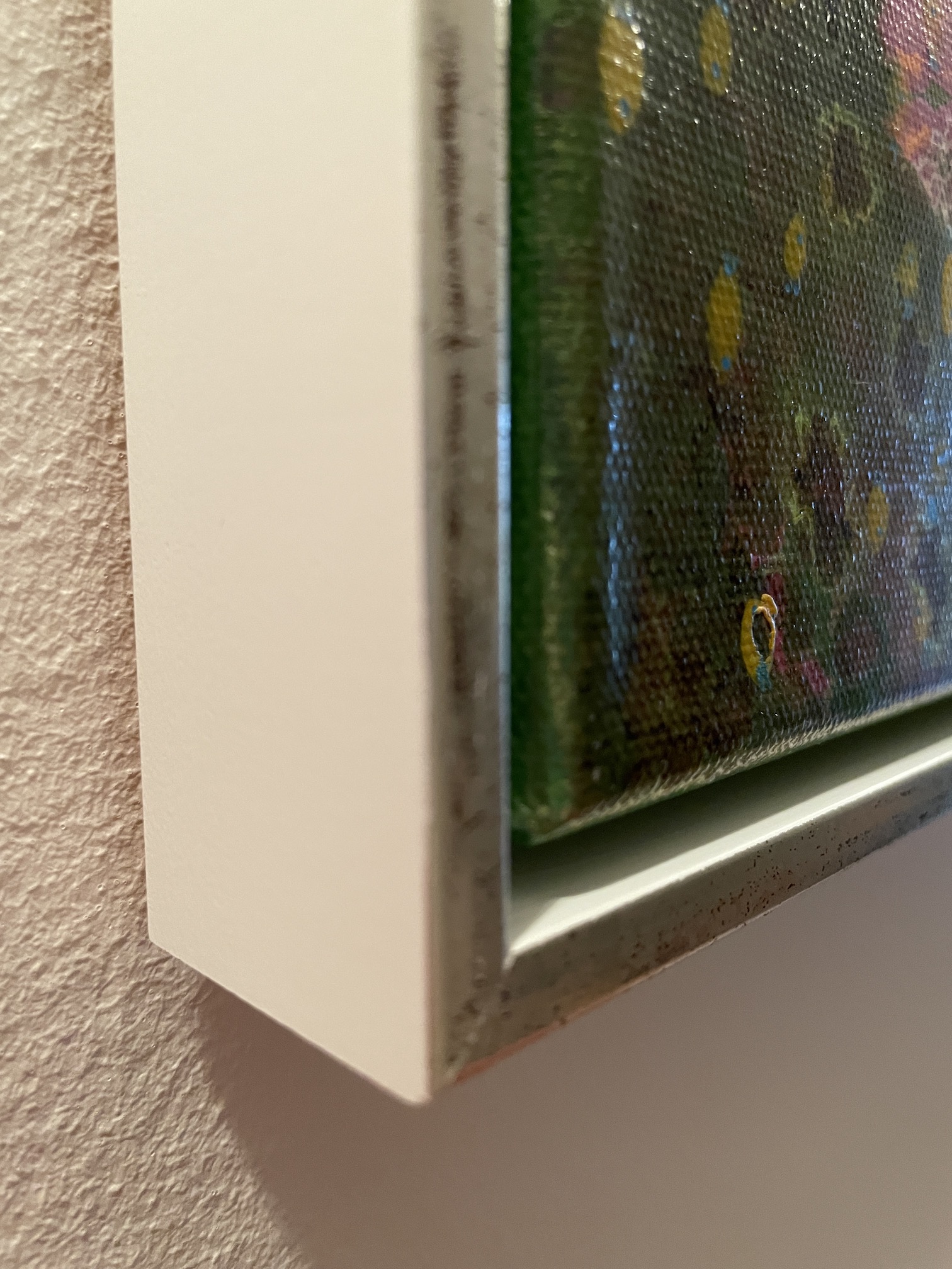 En flytande ram i silver och vitt ingår. 0,7 cm silver framtill och de vita kanterna är 3,5 cm djupa. Se de sista bilderna. 62,5 x 52,5 x 3,5 cm är det totala måttet.
