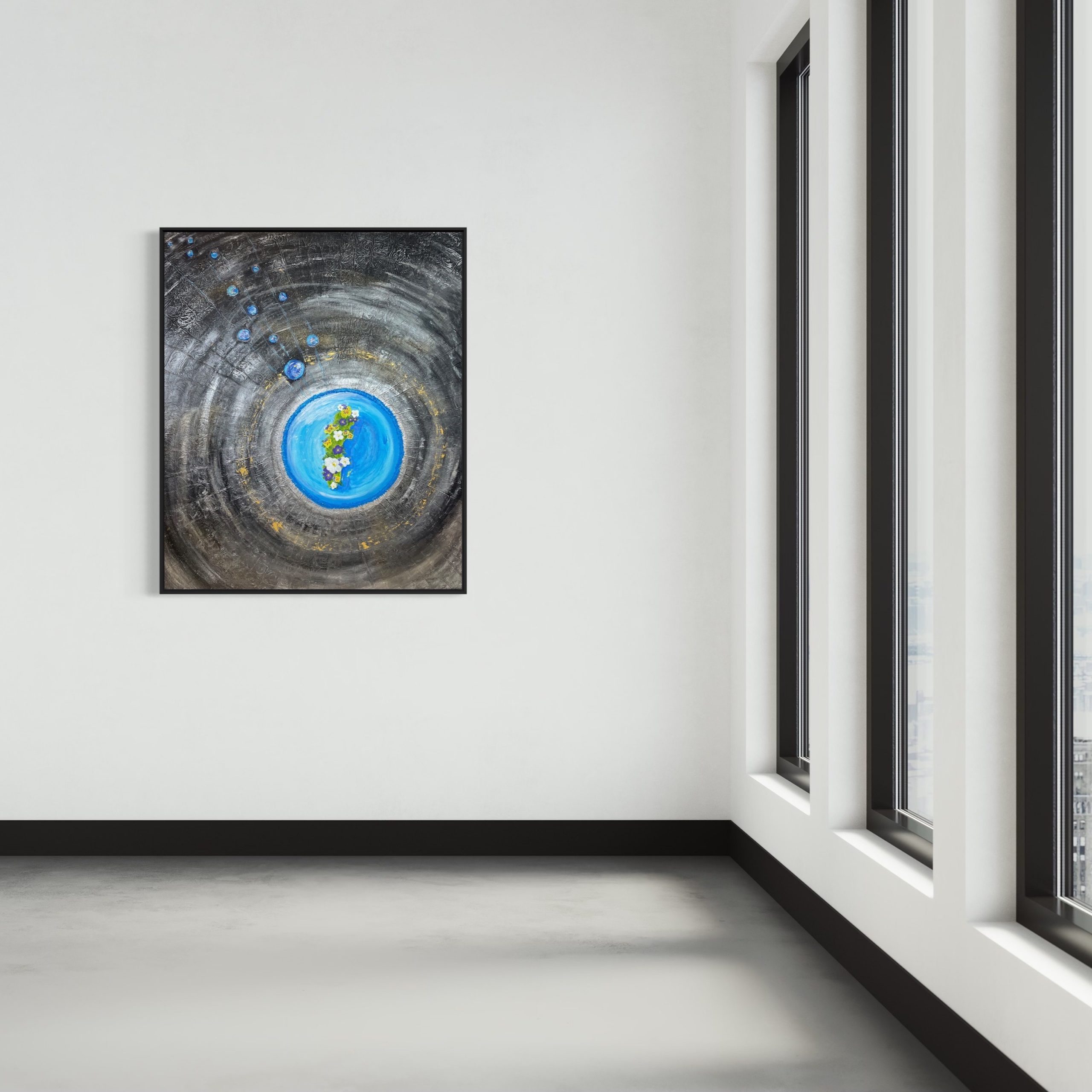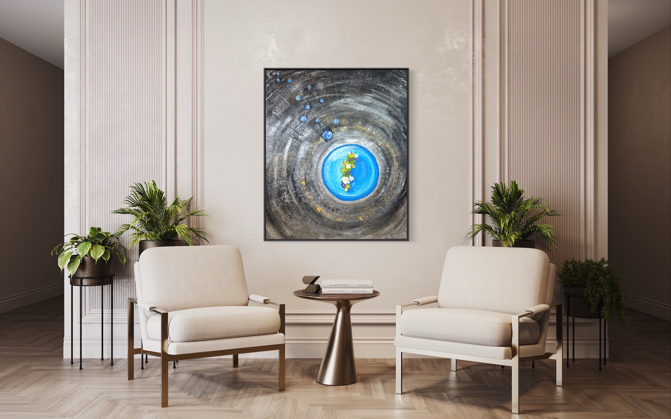 Tavlan är först uppbyggd med struktur som jag har mönstrat och målat i lager med en aning glans i blandningen. Likväl har den en rustik, lite antik känsla i detaljer där svart möter matt silver. Den breda vackra kanten gör en ram helt onödig.